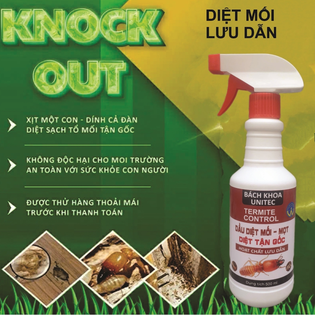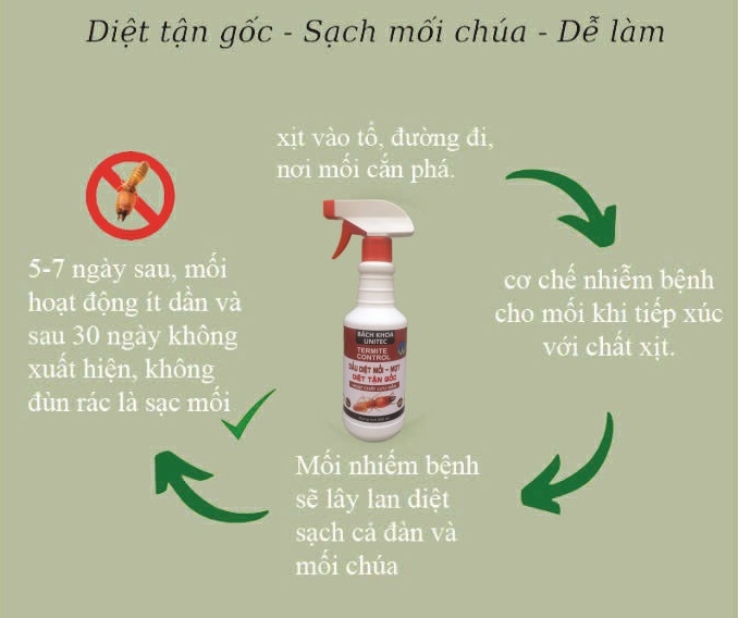 Chai xịt diệt mối Bách Khoa Unitec kiểm soát tập đoàn mối bằng cách gây nhiễm các con mối đi kiếm ăn. Với liều cực thấp này mối chết chậm. Trước khi chết chúng có thể truyền hoạt chất qua những con mối khác trong tập đoàn. Làm lan truyền hoạt chất khắp hệ tập đoàn mối, gây nên số mối chết đáng kể cho dù chính chúng không tiếp xúc trực tiếp với vùng đã xử lý thuốc.