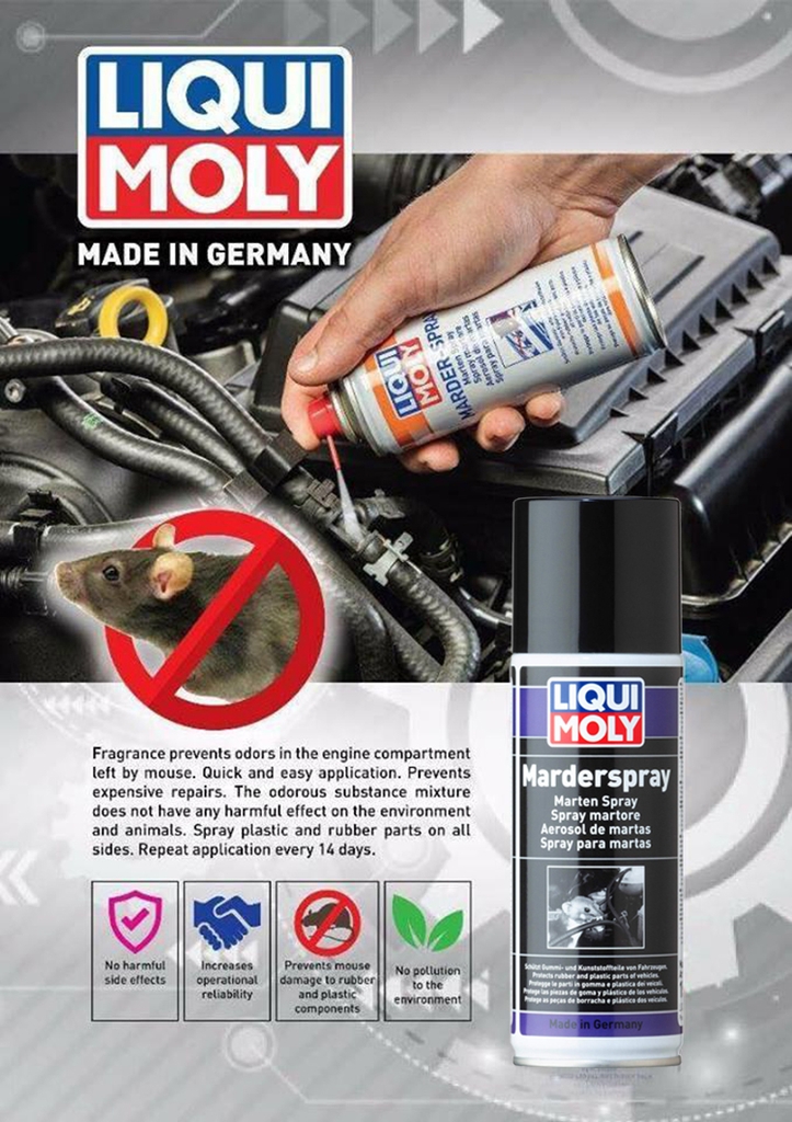Chai Xịt Đuổi Chuột Liqui Moly Marderspray bảo vệ các dây điện, cao su, nhựa trong khoang động cơ và các vị trí trên ô tô khỏi sự cắn phá của chuột và các loại gặm nhấm đây là một trong những cách chống chuột an toàn, hiệu quả nhất cho xế yêu của bạn.