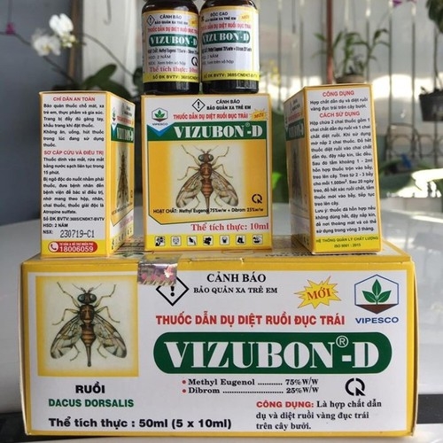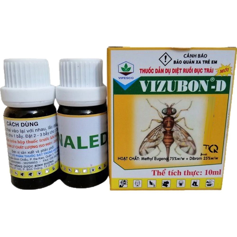 Thuốc dẫn dụ ruồi vàng đục trái Vizubon hộp nhỏ 10ml gồm 1 chai thuốc dẫn dụ ruồi và 1 chai chất diệt ruồi với thành phần: Methyl Eugenol 75% + Dibrom 25%.