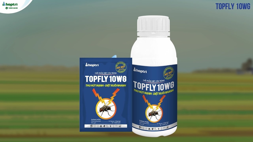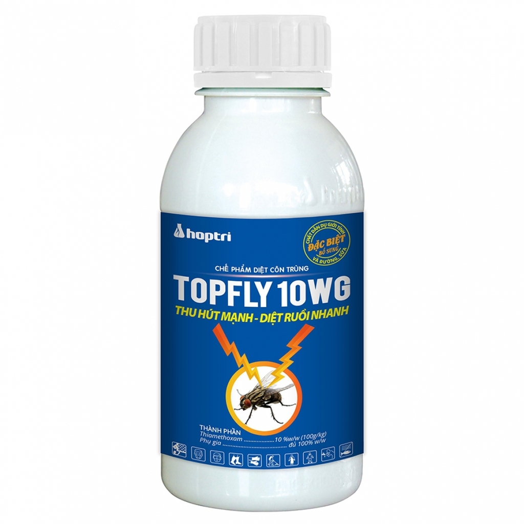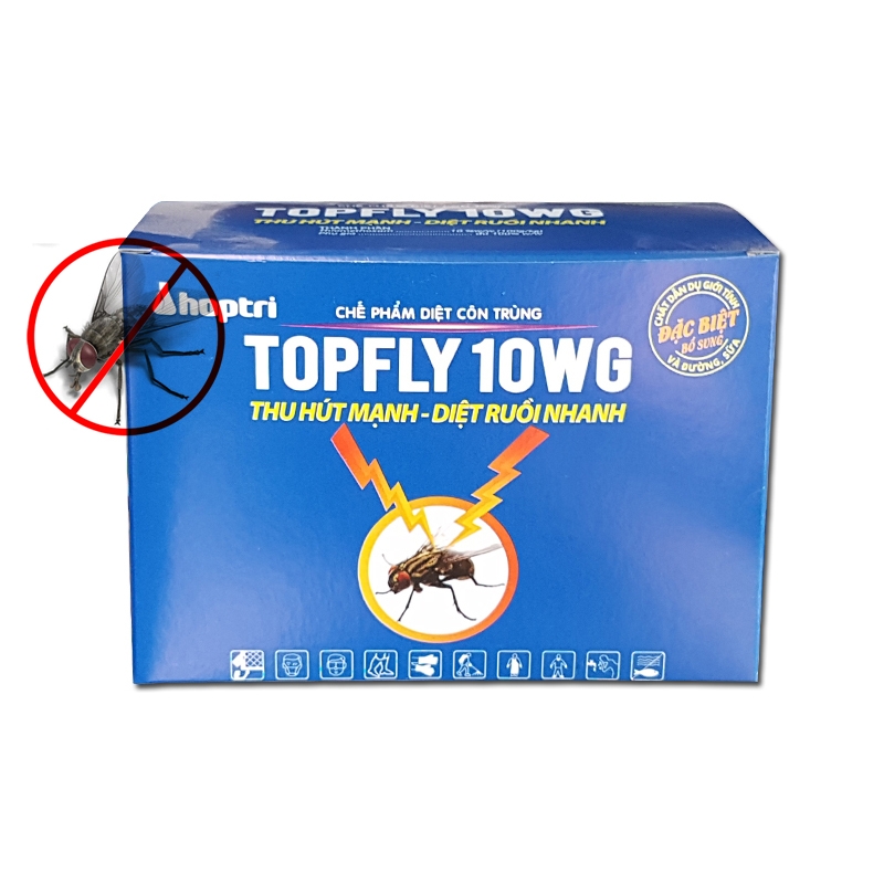 Topfly 10WG là sản phẩm thuốc diệt ruồi sinh học thế hệ mới, có công dụng diệt trừ tận gốc các loài ruồi phổ biến trong nhà và nhiều loài côn trùng khác. Có thể pha với nước để dùng hoặc rắc trực tiếp lên sàn nhà. Chế phẩm nguyên mẫu dạng bả nhỏ màu trắng do Hợp Trí sản xuất.